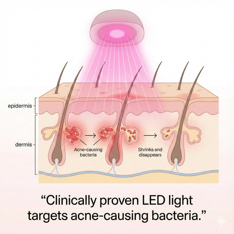 THE BLUE LED LIGHT PENETRATES THE PORES AND ELIMINATES ACNE-CAUSING BACTERIA (P. ACNES), WHICH IS THE MAIN TRIGGER FOR BREAKOUTS. THE RED LED LIGHT THEN CALMS INFLAMMATION, REDUCES SWELLING, AND SUPPORTS FASTER SKIN RECOVERY. THIS COMBINATION DELIVERS POWERFUL, DERMATOLOGIST-LEVEL CLEARING IN JUST 3 MINUTES.